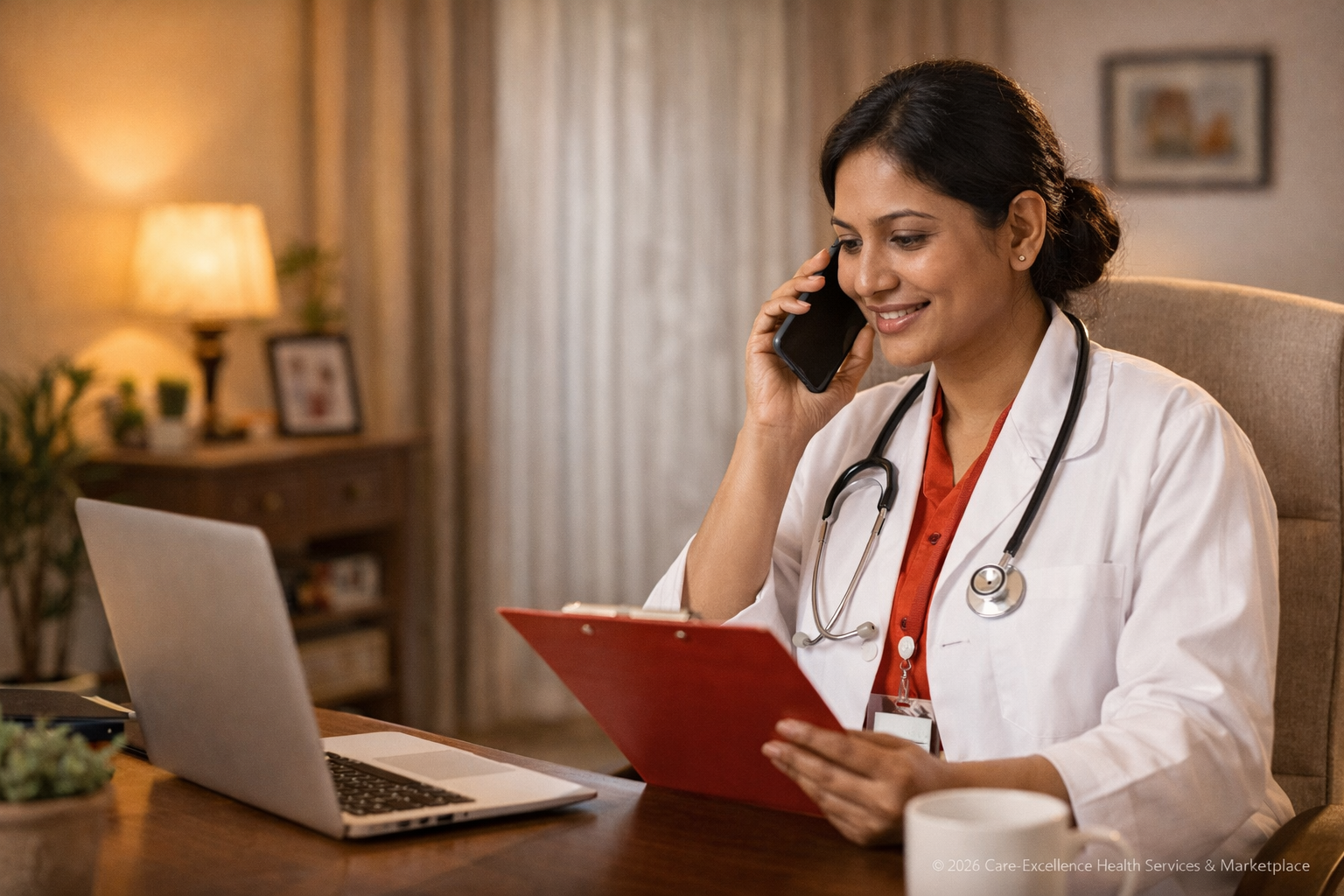 A qualified doctor provides on-call medical guidance from home, reviewing patient information and responding with care and professionalism. Care-Excellence ensures families have fast access to reliable medical support - bringing peace of mind through verified doctors and responsive healthcare, day or night.