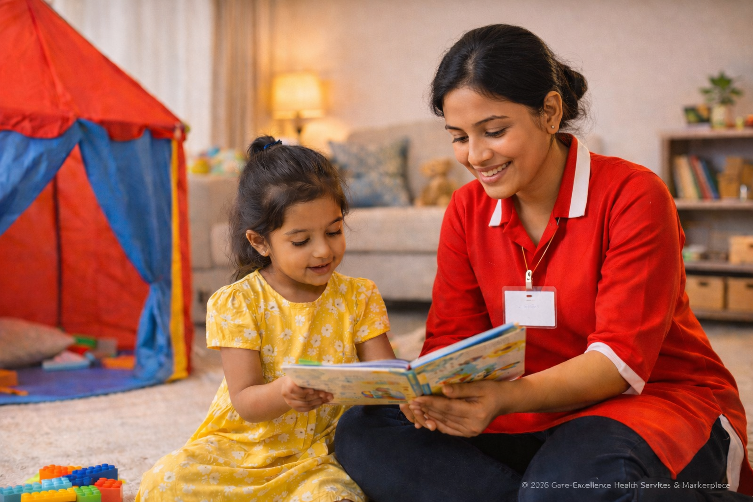 A trained Bangladeshi nanny attentively supports a chilid during a calm indoor activity, balancing care, learning, and safety with ease. At Care-Excellence, our nannies are prepared to handle multi-child households with patience and structure—giving parents confidence that every child receives equal attention and nurturing care.