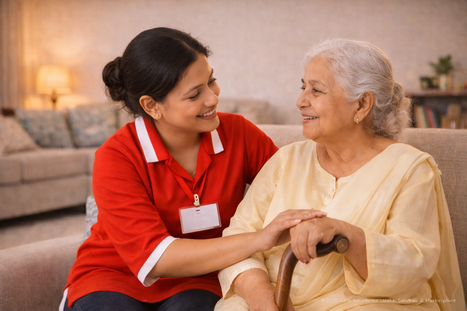 A trained Bangladeshi caregiver offers steady, hands-on support to an elderly client inside a familiar home environment. This moment reflects Care-Excellence’s commitment to culturally aware, respectful care delivered by verified professionals who understand both medical needs and human connection.