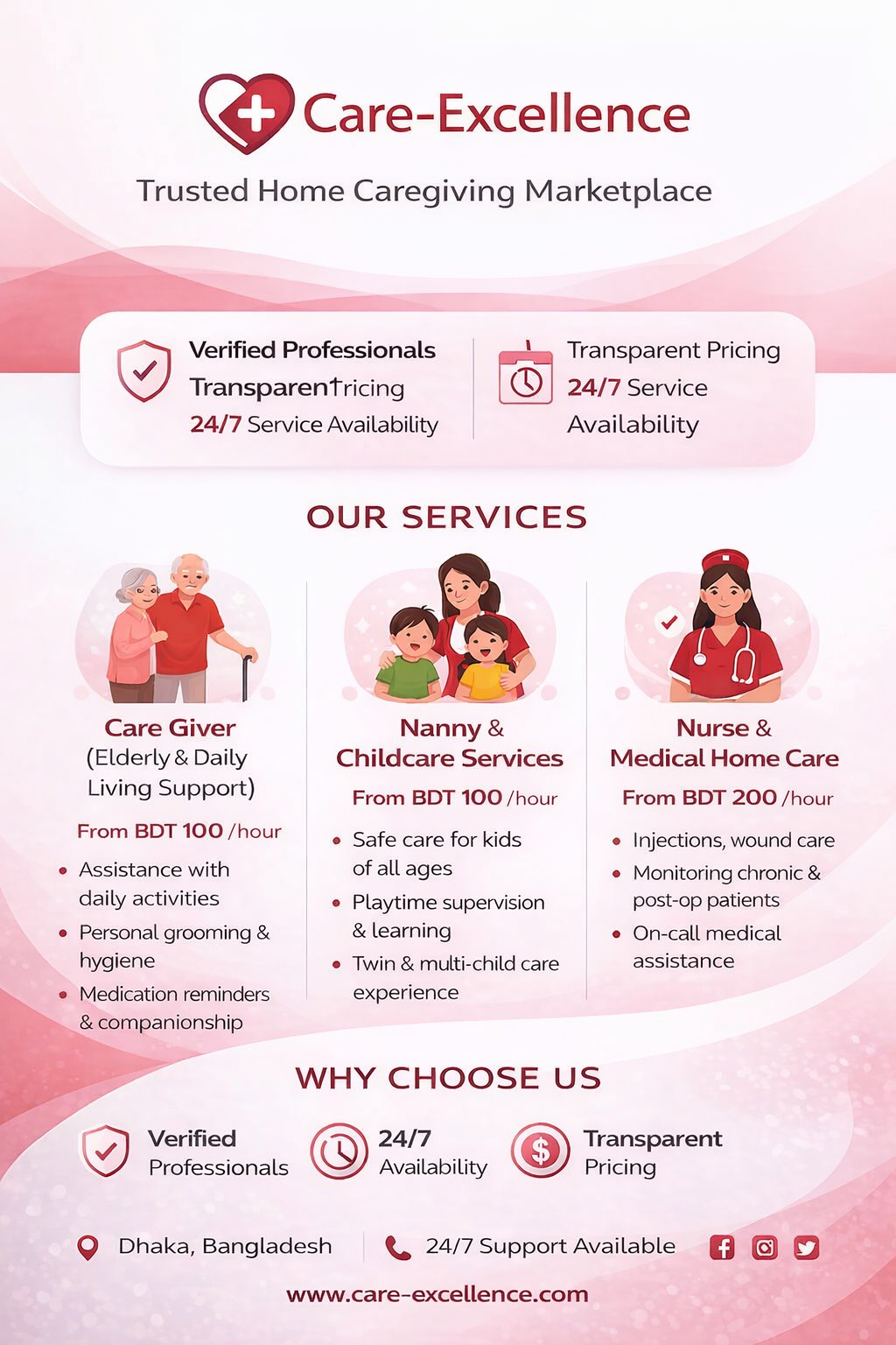 A clean, professional overview of Care-Excellence’s home caregiving services, designed with a calm red-and-white aesthetic that reflects trust, care, and reliability. This brochure highlights our core offerings—elderly care, nanny and childcare support, and medical home care—along with transparent pricing, 24/7 availability, and our commitment to verified professionals, all without human imagery to maintain a modern, institutional feel.