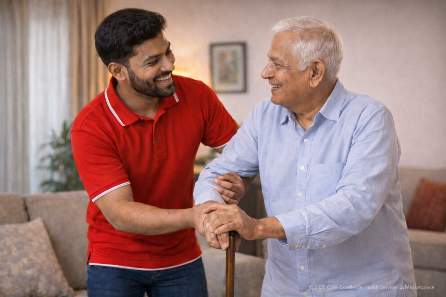 A dedicated caregiver gently supports an elderly client in the comfort of their own home, offering daily assistance with dignity, patience, and respect. At Care-Excellence, our caregivers go beyond tasks—they build trust, companionship, and a sense of safety for families who want the best care for their loved ones.